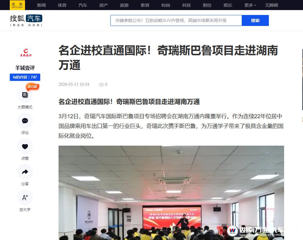 【搜狐网】进校直通国际!奇瑞斯巴鲁项目走进湖南万通