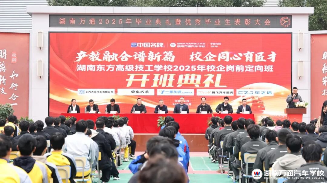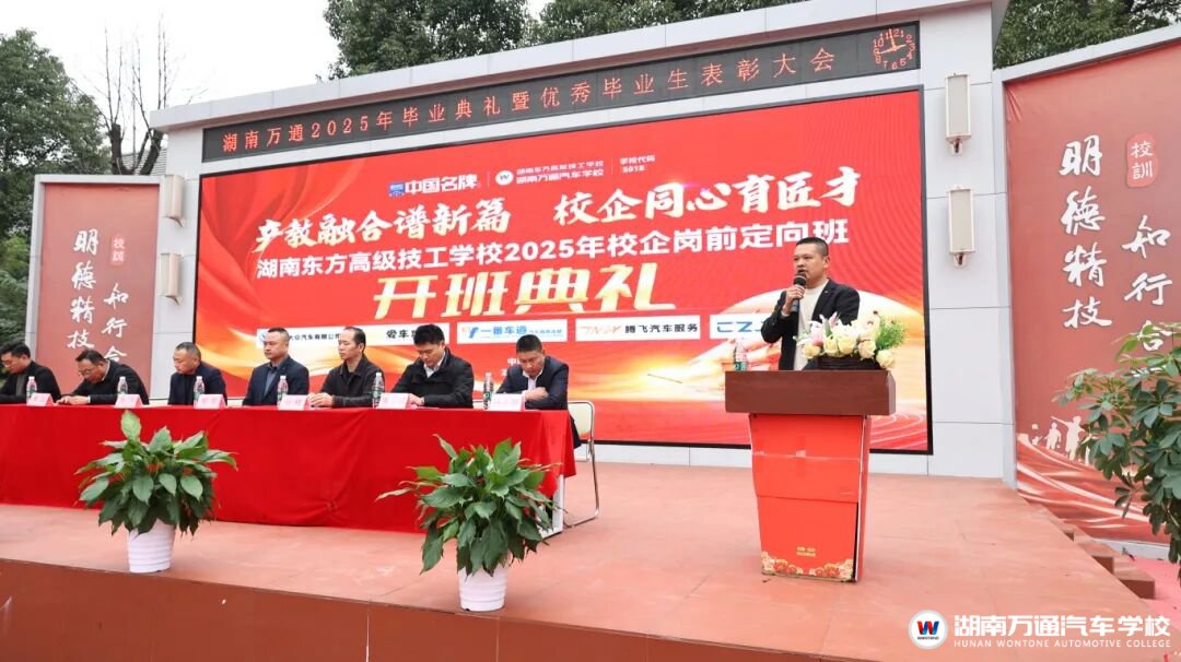在隆重的授牌仪式上,湖南东方高级技工学校万通汽车学院校长助理张助代表学校,与各合作企业代表共同完成了定向班授牌。这一仪式不仅象征着校企双方合作的正式深化,更代表着一条“校中有企、企中有校”的协同育人通道正式贯通。